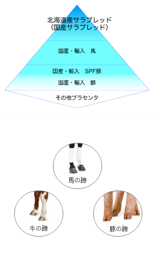 当社製品で使用されている馬由来プラセンタは、品質・安全性が優れているものの希少価値が高く、特に「北海道産サラブレッドプラセンタ」は最高ランクの評価がされている最高級原料です。